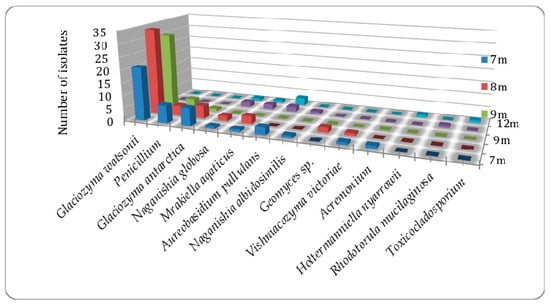 The distribution of fungi was explored both by depth in Lake Fryxell as well as potential seeding by input by glacial streams. Isolates from all three field seasons were used for distribution determination. The total fungal abundance above the sharp chemocline of 11 m was higher than below with little over all abundance difference between 7 m and 9 m (Figure 4 and Figure 5, Table 1). Although Glaciozyma spp. and Penicillium spp. comprised the largest number of the fungal abundance above 11 m, they were not found in samples below 11 m. There were several species found both above and below the 11-m chemocline boundary, however only three species were found exclusively below 11 m (Clavispora lusitaniae, Holtermanniella nyarrowii, and Toxicocladosporium strelitziae).