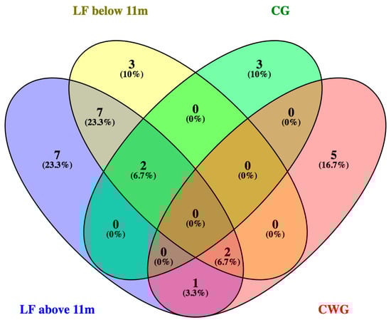 A Venn’s diagram of fungal taxa shown by Lake Fryxell (LF) isolate above and below 11 m depth as well as streams feeding Lake Fryxell of Canada Glacier stream (CG) and Commonwealth Glacier stream (CWG).