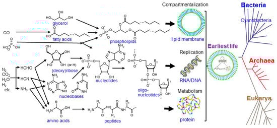Structures, components, and abiotic synthetic pathways of bio-macromolecules operating in accordance with the three fundamental functions of life (compartmentalization, replication, and metabolism), modified from Kitadai and Maruyama [].