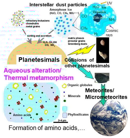 Schematic processes of evolution of organic molecules from interstellar icy dust particles, their accumulation to planetesimals, and aqueous alteration/thermal metamorphism inside the planetesimals leading to the formation of life’s building blocks such as amino acids. They could have been delivered in meteorites and micrometeorites to Earth by collisions with other planetesimals.
