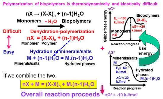 Schematic illustration of thermodynamic and kinetic difficulty for polymerization of biopolymers. Hydration of minerals/salts would enable these polymerization processes (modified from Nakashima and Shiota []).