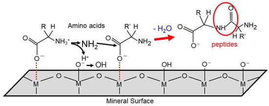 Schematic surface activation mechanisms of glycine polymerization on oxide minerals, modified from Kitadai et al. [] with copyright permission from the journal.