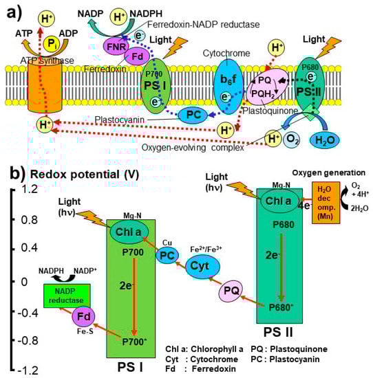 (a) Present day photosynthetic pathways in the lipid membrane and (b) redox potentials of the photosynthetic systems I (PSI and II (PSII), modified from Blankenship [] and Martin et al. [].
