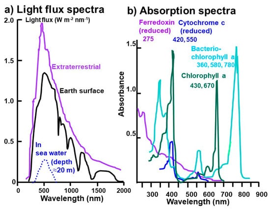 Sun lights arriving at the present Earth’s surface is mostly in the 300 to 1300 nm wavelength range, while those at the depth of 20 m in sea water is narrower around 500 nm (Figure 6a) [,,]. On the other hand, major photosynthetic pigments do not use lights around 500 nm but absorb 275 nm for ferredoxin, 420 and 550 nm for cytochrome, 430 and 670 nm for chlorophyll a, and 360, 580, and 780 nm for bacteriochlorophyll a (Figure 6b) [,].