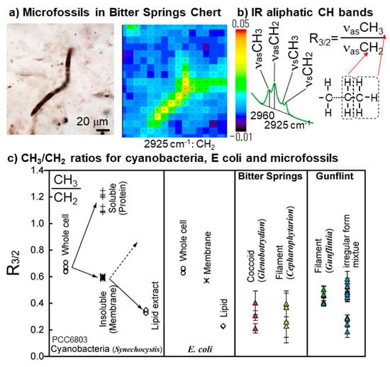 IR micro-spectroscopy revealed distributions of aliphatic C–H bonds corresponding to microfossil structures in Bitter Springs (0.83 billion year old) [] and Gunflint cherts (1.9 billion year old) [] (Figure 7a). The CH3/CH2 peak height ratios of microfossils, which correspond to relative length and/or branching of aliphatic chains of lipids [], were found to be similar to those of modern cyanobacteria [] (Figure 7b,c). Aliphatic C–H bonds have also been detected in microfossils and/or carbonaceous matter in Wumishan stromatolites (≈1.5 billion years) [] and Doushantuo phosphorites and cherts (≈0.58 billion years) [,].