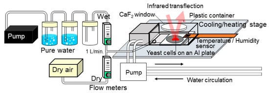 Yeast (Saccharomyces cerevisiae) is one of the unicellular eukaryotic microbes employed in fabrication of breads. Dried yeast cells are known to be in dormancy and can return back to activities upon rehydration. We are now studying these transition processes among dormancy, viable states, and death by means of an original in situ IR microspectroscopy system with controls of relative humidity (RH) and temperature (T) (Figure 8). RH in a plastic container with a CaF2 window was controlled by flowing a mixture of dry and wet air. By changing the flow rates of the dry and wet air with flowmeters to be the total flow rate at 1 L min−1, the mixed air introduced to the plastic cell can be controlled from about 2 to 80% RH []. Dry yeast powders were placed on an Al plate on a Peltier cooling–heating stage (−20 to 120 °C) in the RH/T control cell (Figure 8). IR transflection (transmission–reflection) spectra were measured every 1 minute during RH/T changes.
