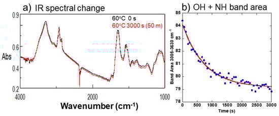 (a) IR spectral changes with time of the yeast cells heated at 60 °C for 0 and 3000 s. (b) Changes with time for the first 3000 s in the IR band area at 3005–3630 cm−1 (OH + NH) of the yeast cells heated at 60 °C. A fitting exponential curve is also shown.