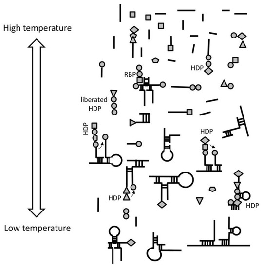 Formation of Hybridization Dependent Peptides (HDPs). The process requires thermal and wet/dry cycles to facilitate hybridization events between randomly aminoacylated RNAs. Short sequences anneal due to Watson Crick base pairing bringing RNA termini in close proximity in the newly formed complexes. This brings some amino acids (represented by circles, diamonds, triangles or pentagon shapes) close enough to form peptide bonds. During the next cycles when the temperature rises, RNA will melt and the complexes will turn into ssRNA or will degrade. Previously formed peptide will stay with RNA or will be liberated. In every cycle, a new amino acid may be added to the existing di, tri, or more amino acid-containing peptides, allowing the formation of longer HDPs (2–5 amino acids). Given the fact that that the process of aminoacylation of RNA is random, we expect newly formed HDPs to be random with compositions following amino acids abundance. Some of the HDPs would possess the ability to bind and stabilize RNA. We call these RNA-binding peptides (RBPs).
