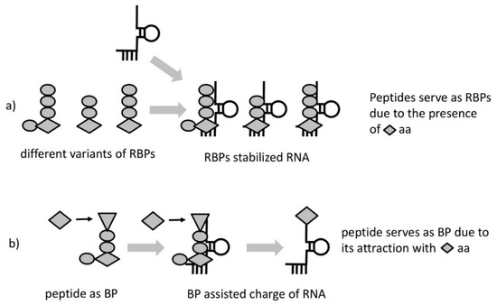 RNA binding peptides (RBPs) and bridge peptides (BP). (a) RBPs are HDPs which contain amino acid (represented by diamond shape) facilitating the interaction with RNA. HDPs will interact and stabilize the RNA they interact with. (b) A modified variant of RBP serves as BP due to its triangle aa attracting a diamond aa to RNA, facilitating de-novo aminoacylation. The function of the BP is to increase the chance of a particular amino acid (here in diamond shape) to aminoacylate the RNA bound by the BP.