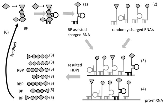 Transition from non-coded to coded peptides. Initially, non-coded BP assembled by chance are involved in specific aminoacylation of certain RNAs (1). HDPs are formed (3) by both BP-aminoacylated RNAs (bold) (1) and a variety of randomly charged RNAs (light grey) (2) in cycles as described in Figure 1 where same RNA may hybridize with many aminoacylated RNAs. The newly formed HDPs are different variants and most are without significant contribution to RNA stability (3). In some HDP variants however, RBP or BP are synthesized using BP-charged RNA (4). The hybridization process between BP-aminoacylated RNAs and ”template” RNAs (4) (pro-mRNA) place a specific amino acid in a specific position relative to the other amino acids in a way that reproduce BP (5) or RBP (5). This BP is involved in charging another RNA that has a similar sequence (6). At this point the cycle is closed increasing the chance that the newly produced BPs would be involved in a new round of BP formation. The feedback cycle (6), (1), (4), and (5) provides stability due to the fact that the BP increases the chance to reproduce stabilizing forms of RBP and BP. The information in that case is transferred from the sequence of BP assisted aminoacylation via pro-mRNA to the BP and RBP: A Darwinian selection is established.
