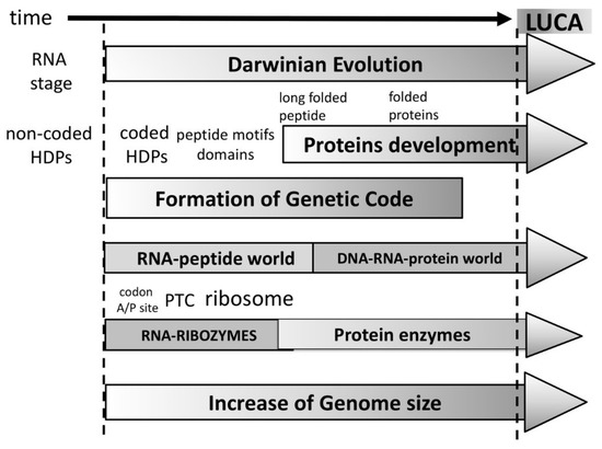 Outline of most significant events leading to the Last Universal Common Ancestor (LUCA). The events that occurred during the same time period are shown vertically. Transition from non-coded to coded peptides gave rise to Darwinian evolution as described in Figure 3 and continue ever since. Proteins develop from small sized peptides with only a fraction of coded amino acids to formation of motifs and domains with increased coded content. At a later stage the peptides became able to fold and form catalytic centers leading to formation of proteins with fixed 1st and last amino acids. At the same time standard genetic code expands to cover more codons for at least 20 amino acids. By the time when the first proteins are fully formed the genetic code is established as we know it. During the period of short peptides and lack of folded peptides/proteins (RNA-peptide world) certain RNAs with catalytic functions were selected (ribozymes) to perform critical catalytic functions. This is time when the ribosome obtained its basic shape. By the time the peptides begun to fold and acquire new enzymatic functions, the ribozymes were already established and could not be replaced, but started to co-exist together with proteins. The genome size increased proportionally covering the information for all proteins and ribozymes. The Last Universal Common Ancestor (LUCA) emerged when all of its components—the ribozymes, genetic code, and proteins were functioning in full synchrony.