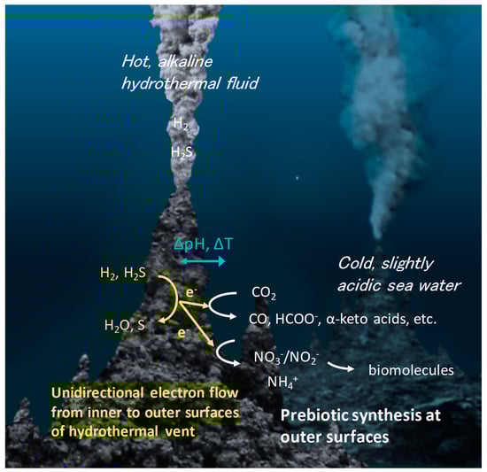 Deep-sea hydrothermal systems associated with the serpentinization of ultramafic rocks are among the most plausible geological settings for life to have originated [8,10,13,15,17,18,36,37]. The temperature, pH, and chemical composition differences between hydrothermal fluid and seawater generate a steep redox gradient across the sulfide-rich vent rocks, thereby serving as the driving force for prebiotic chemistry [5,8,9]. In addition, the generation of a chemical potential gradient across electrically conductive metal sulfides provides a continuous and unidirectional supply of high-energy electrons from the inside of the vent to the outside of the rock wall, as has been proposed based on the electrochemical analysis of hydrothermal vent minerals [17,19,21] and the electrochemical potential mapping of deep-sea hydrothermal fields [13,17,18]. In this environment, the high-energy electrons continuously supplied by the natural geoelectrochemical reactor trigger CO2 reduction to CO and CH4 and nitrate and nitrite reduction to NO, N2O, and NH3, as demonstrated in recent laboratory investigations [14,15,16,38]. Under the continuous flow of electrical current from a hot, reductive hydrothermal fluid to cold seawater, the ocean-vent interface is ideal for prebiotic chemistry, as organic molecules crucial for the life’s origin, including α-keto acids, amino acids, and oligonucleotides are typically unstable at high temperatures [5,8]. In addition, the unique nano- and micro-scale structures of metal sulfides in hydrothermal vent environments may have promoted the concentration and organization of the synthesized molecules, preventing them from diffusing into seawater [39,40].