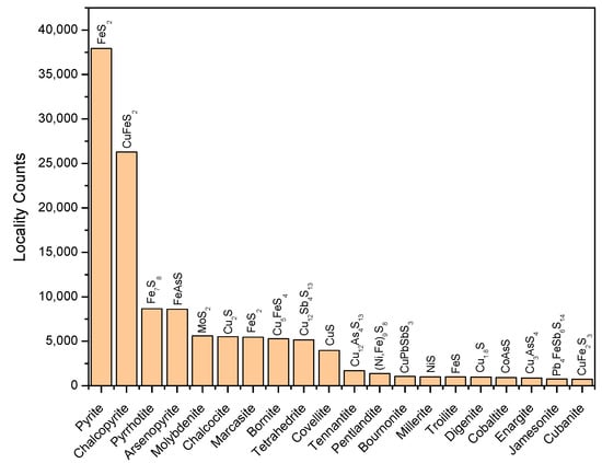 Metal sulfide distribution in natural environments. The 20 most frequently observed species are ranked in order of locality counts. The chemical composition of each species is shown.