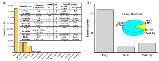 (a) Distribution and chemical diversity (chemical composition, Fe/S valence states, and crystal symmetry) of Fe single-metal sulfides. (b) Relative abundances and locality distribution of Fe2+-, Fe3+-, and Fe2+ plus Fe3+-sulfides. Note that the valence state of arsenopyrite (Fe3+(AsS)3−) in the RRUFF mineral database is examined as (Fe2+(AsS)2−) in this review based on electric spectroscopic observations [76,77].
