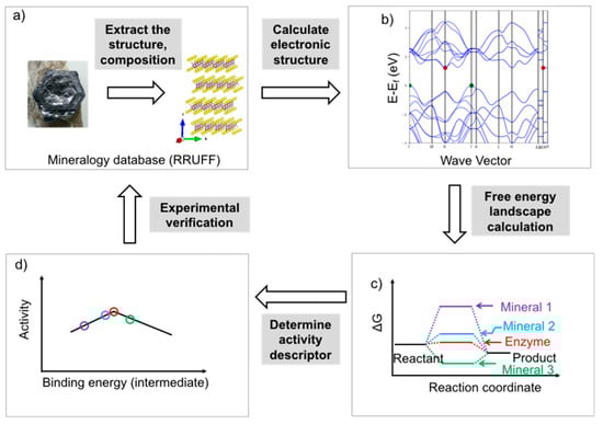 Owing to advances in protein crystallography, high-resolution enzyme structures are becoming increasingly available (e.g., 132,902 protein structures are deposited in the Protein Bank Database as of 9 August 2018). The Protein Bank Database provides structural information for numerous metal-sulfur enzymes, from which the metal-sulfur distance, sulfur-metal-sulfur angles, and coordination symmetry around the metal center can then be determined. The LUMO and HOMO energy levels of enzyme active centers can be calculated using quantum chemical methods based on simplified enzyme structural models [164,165]. These parameters can be compared with the corresponding crystal structures and band energies of inorganic minerals [71,166,167]. Such comparisons between the electronic structure of minerals and enzymes would aid the screening and identification of suitable mineral catalysts for specific target reactions.