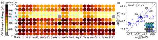 (a) Rational screening of CO adsorption energy on the second-generation core-shell alloy surfaces using the developed neural network model. (b) The parity plot shows a comparison of the CO adsorption energies on selected Cu monolayer alloys calculated by the neural network model and self-consistent density functional theory (DFT) (adapted from Reference [160]).