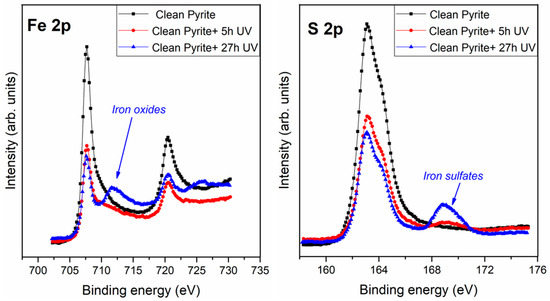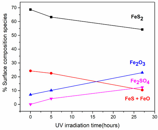 UV irradiation has an effect on the pyrite surface even after a very short time, such as 5 h of exposure, confirmed by the appearance of the sulfate species and a remarkable increase in the oxidized species; furthermore, a higher increase in the oxides and sulfate species is shown at 27 h of exposure. Consequently, the pyrite surface is highly sensitive to chemical changes induced by UV irradiation, meaning that pyrite surface chemistry could be easily affected by environmental conditions and is highly reactive, which would be a necessary condition for a potentially effective catalyst.