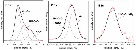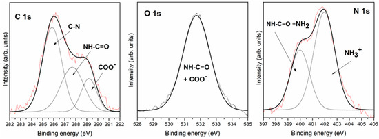 Triglycine adsorption on the pyrite surface under ultra-high vacuum conditions (absence of oxygen and in-situ molecular deposition by evaporation in UHV) was analysed by XPS, which is well suited to characterize the possible chemical changes in molecular interactions on surfaces due to its high sensitivity and non-destructive nature. The in situ XPS analysis of triglycine adsorption on the pyrite surface revealed the presence of carbon, oxygen and nitrogen on the pyrite surface under UHV conditions (see Figure 4). The best-fit curve for the C 1s peak was obtained using three components for the small peptide, triglycine, and the first carbon component had a binding energy (B.E.) of 285.8 eV and was attributed to the C-N group [36,37]; the second component was observed at 287.7 eV due to the amide group (-NH-CO-), and the presence of a third carbon component at 289.2 eV was assigned to the COOH or COO− groups [38]. The intensity ratio of the three components was 3:2:1 (CN: -NH-CO-:COO− or COOH), which is in close agreement with the chemical formula of the molecule. The O 1s peak was observed at 531.8 eV and was attributed to one component, the oxygen in the COO− groups [31,32,33,34,39] and the C=O of the amide group. The best-fit curve of the N 1s peak consists of two components centred at the binding energies of 400.0 and 402.0 eV, which were assigned to the NH2 + -NH-CO- and NH3+ functional groups, respectively [27,34,35] (see Figure 1 for the triglycine molecule). XPS demonstrates successful adsorption of the intact molecule on the pyrite surface.