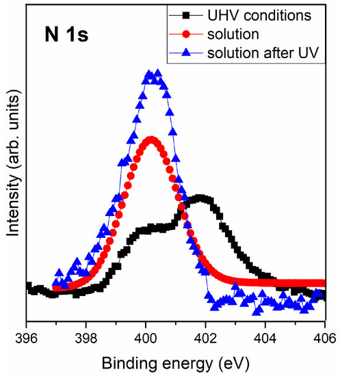 Therefore, the triglycine peptide was successfully adsorbed in three cases: UHV conditions and from a solution before and after UV pyrite surface treatment. Remarkable differences were shown based on the nitrogen signal: two chemical forms were observed under UHV conditions, i.e., NH2 and NH3+, whereas only the NH2 was detected when adsorbing the molecule from solution. Figure 6 shows nitrogen differences from the three different molecular adsorption conditions. The XPS nitrogen signal is a molecular fingerprint on its surface, and a higher intensity of the signal means a higher concentration of molecules on the surface; therefore, as has been previously explained, UV irradiation favours molecular adsorption of triglycine on the pyrite surface (see Figure 6).