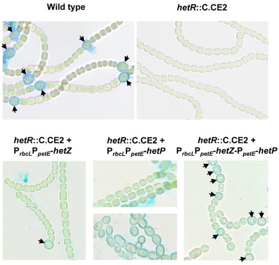 Heterocyst formation in hetR::C.CE2 expressing hetZ, hetP or both from PrbcLPpetE. Filaments were stained by Alcian blue at 24 h after nitrogen stepdown. Most filaments of hetR::C.CE2 with PrbcLPpetE-hetP showed no cell differentiation (upper panel), but a small number of filaments produced enlarged cells in strings (lower panel). Arrowheads point to mature or developing heterocysts.