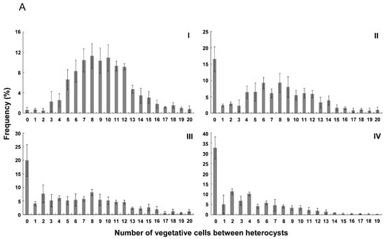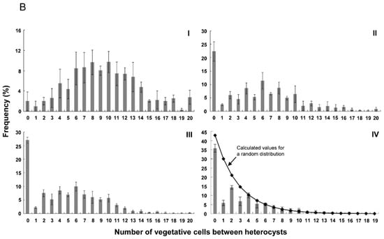 Figure 3 shows the distribution of number of vegetative cells between heterocysts in the wild type and strains with PrbcLPpetE-hetZ-PpetE-hetP. As reported by Khudyakov and Golden (2004) [], there was a bias toward even numbers of intervals, probably due to cell division after differentiation of heterocysts. In hetR::C.CE2 with PrbcLPpetE-hetZ-PpetE-hetP, more than 30% of heterocysts were formed in strings after nitrogen stepdown. At 48 h, frequencies of 0 and even number intervals in this strain were close to calculated values of a random distribution (Figure 3B-IV).