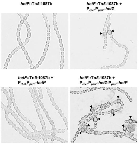 Heterocyst formation in the hetF::Tn5-1087b mutant expressing hetZ, hetP or both from PrbcLPpetE. Filaments were stained by Alcian blue at 24 h after N-stepdown. Arrowheads point to mature or developing heterocysts.
