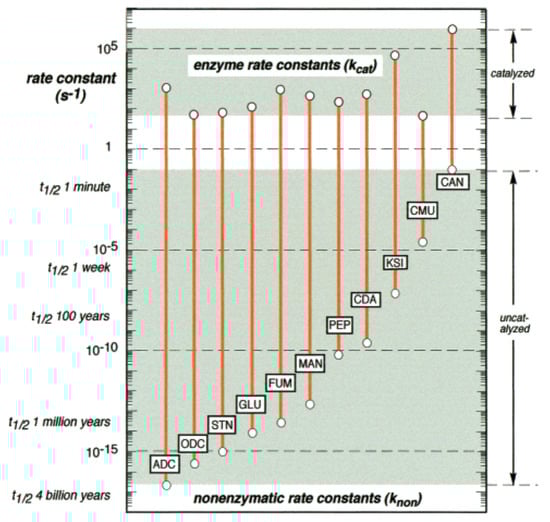 Not only do catalysts significantly increase the rates at which these reactions happen, but they also synchronize these rates more closely. For example, Figure 2 shows a comparison of uncatalyzed and (enzymatically) catalyzed rates for several biological reactions []. The rate increase from uncatalyzed to catalyzed reactions is many orders of magnitude. Furthermore, the range of rates decreases from roughly 15 orders of magnitude to only about three or four orders of magnitude. Both of these properties—an increase in the absolute rates and a decrease in the range of rates—are important for ensuring that living systems function properly [].
