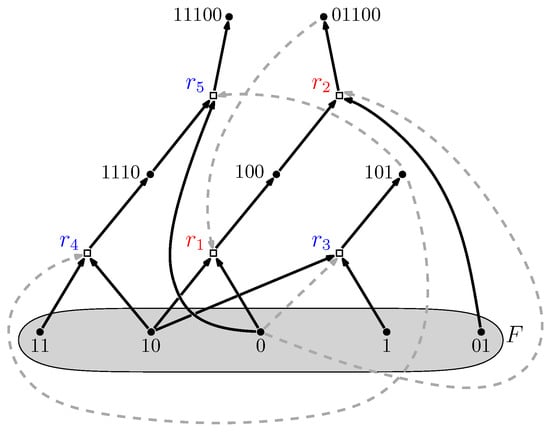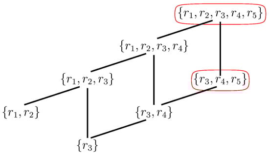 The maxRAF together with all of its subRAFs form a partially ordered set (poset) under set inclusion. The minimal elements of this poset are called irreducible RAFs (irrRAFs): Removing any reaction from an irrRAF results in a set that no longer is (or contains) a RAF. In other words, they are in some sense the “smallest” RAFs, and presumably the first ones to emerge in a dynamical sense. Finding irrRAFs in any CRS can also be done in polynomial time (i.e., efficiently); however, there can be exponentially many of them (in terms of the number of reactions in the maxRAF), so enumerating all of them can, in general, cannot be done efficiently [,,]. Figure 4 shows the poset of subRAFs for the maxRAF of Figure 3.