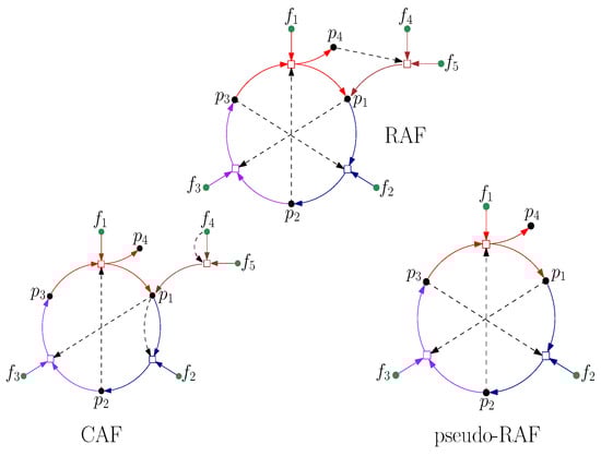 Finally, the concept of collectively autocatalytic sets was introduced to capture the notion of the collective replication of entire sets of molecules, which can be expected to emerge spontaneously in systems with a large enough diversity of molecule types []. Autocatalytic sets consist of a set of molecule types that mutually catalyze each other’s formation from a basic food source, thus focusing on catalytic closure as a specific (chemically-based) instance of functional closure. They were studied both mathematically and with computer simulations [,,,,] and, contrary to most of the other models, various experimental chemical examples of autocatalytic sets do exist [,,,,]. The notion of autocatalytic sets has been studied more extensively as RAF theory [], which will be the focus of the remainder of this paper.