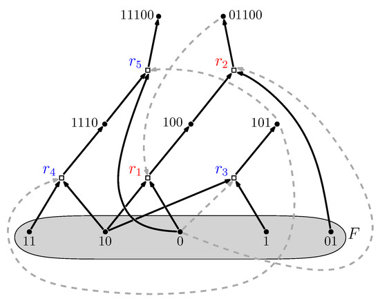 An example of a reflexively autocatalytic and food-generated (RAF) set that appeared in a simple binary polymer model where molecules are “bit string polymers” that can be ligated together into longer ones (see next section). Solid dots represent molecule types (labeled by bit strings); open squares represent reactions (ligations). Solid arrows indicate molecule types going into (reactants) and coming out of (products) a reaction; dashed grey arrows indicate which molecule types catalyze which reactions. The food set F consists of the monomers and dimers (i.e., bit strings of lengths one and two). Adapted from [24].