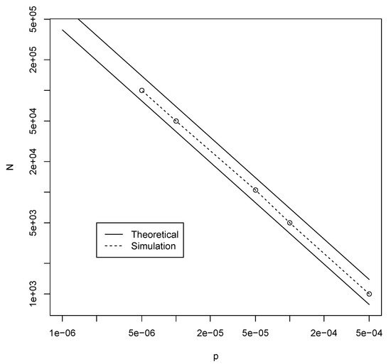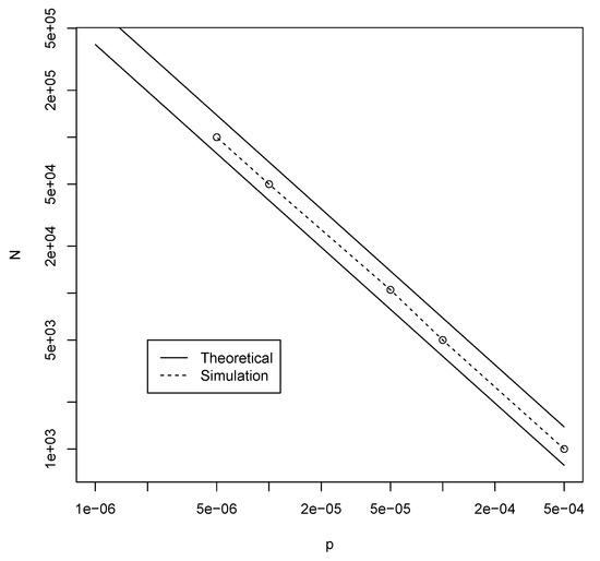 Thus, given a fixed probability of catalysis p, inequality (2) predicts what the minimum value for n (the maximum polymer length) is for which autocatalytic sets are likely to appear. For example, for , the right-hand side of inequality (2) becomes 14.61. Using , the left-hand side gives a value of 14.17, which is just short of 14.61. However, gives a value of 15.32, which is larger than 14.61. So, for n at least 12, there should be a high probability that an instance of the binary polymer model with will contain an autocatalytic set. Figure 2 shows the corresponding values for n (solid line) for various values of p, as derived from inequality (2).