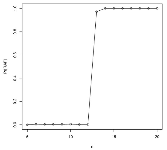 Taking this probability of catalysis p to be on the order of , i.e., in between the more conservative estimate from [45] and the more optimistic estimate from [46], the results from Section 3.1 indicate that in the binary polymer model a maximum polymer length of is required for autocatalytic sets to arise with high probability. This implies a molecular diversity of around 16,000 polymer types (see also Table 1), with autocatalytic (RAF) sets for these parameter values containing on average 14,000 polymer types, while irrRAFs can be expected to contain just over 4000 polymer types.