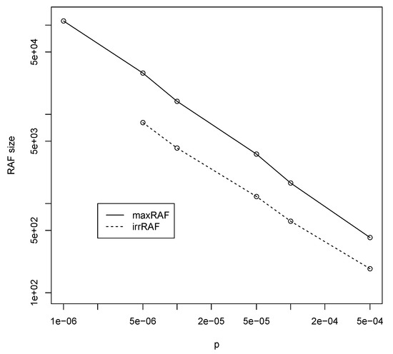 Finally, note that for the maximum polymer length required for autocatalytic sets to form is , which means the total number of polymer types is . However, from the simulation results using the RAF algorithm, it turns out that the average size of a (max)RAF set is about 14,000 polymer types. Furthermore, irreducible RAF sets (irrRAFs) are even smaller, just over 4000 polymer types on average. Figure 4 shows average maxRAF (solid line) and irrRAF (dashed line) sizes for different values of p and corresponding required n. These RAF sizes appear to follow a straight line in a log-log plot very closely, and thus decrease as a power law with increasing values of the probability of catalysis.