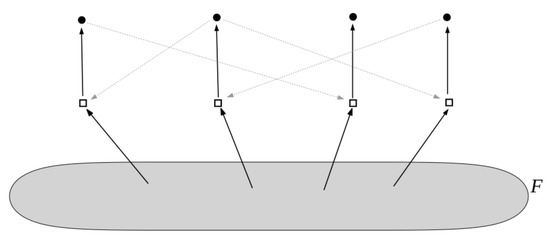 The food set F is a subset of molecule types that can be assumed to be available in the environment (i.e., they do not necessarily have to be produced by any of the reactions). A simple example of an autocatalytic (RAF) set is shown in Figure 1. A mathematically rigorous definition of RAF sets is provided in [22,23].