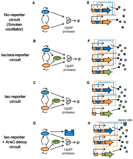 Similar to our previous modeling study where the addition of a reporter gene to upstream genes changed oscillation dynamics of those circuits [12], we compared a genetic circuit with a modified one containing the replacement of a protein-binding site in a downstream reporter promoter region (Figure S1). Although upstream regulatory genes in living cells used in the previous oscillation study were accompanied by the downstream reporter gfp gene driven by the lac/ara promoter (lac/ara-reporter circuit; Figure 1B,F), the original modeling of the oscillator excluded the binding of regulatory proteins to their protein-binding sites in the reporter gene [11]. In contrast, we recently demonstrated the effects of retroactivity and protease sharing by the addition of the reporter protein using mathematical model [12]. In this study, we also modeled the dynamics of the Smolen oscillator connected to another reporter gfp gene driven by the lac promoter (lac-reporter circuit; Figure 1C,G, Figures S2 and S4). The detailed mathematical modeling is described in Figure S1, the Methods Section 2.1, Appendix A and the Supplementary Materials.