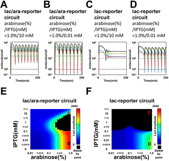 Upon the removal of AraC-binding sites in downstream reporter genes, simulation of the lac-reporter circuit resulted in a narrowed oscillation area for each concentration of the two inducers (arabinose and IPTG), compared with that of the lac/ara-reporter circuit (Figure 3), even though the lac/ara and lac promoters have the same maximum transcription rate in our modeling. We plotted time-courses of the lac/ara-reporter and lac-reporter circuits by ODEs simulations under high arabinose conditions (Figure 3A–D). For some sets of parameters, the variables for numbers of molecules per cell fell below 1. Thus, the stochastic dynamics of molecules possibly regulate oscillations in our living cells. In Smolen’s oscillators, however, stochastic Gillespie and deterministic simulations showed similar periods for a set of parameters [11,41]. From the stability analysis of parameter spaces for the two inducers, the lac-reporter circuit showed a narrower oscillation area than the lac/ara-reporter circuit (Figure 3E–F). In particular, upstream oscillation dynamics in the lac-reporter circuit showed a shorter period with high arabinose and low IPTG concentrations than those in the lac/ara-reporter circuit (Figure 3B,D). We also found, with high arabinose and IPTG concentrations, that the lac-reporter circuit remained fixed, although the lac/ara-reporter circuit oscillated (Figure 3A,C,E,F). Thus, due to differences in regulatory protein-binding sites in downstream reporter genes only, the lac/ara- and lac-reporter circuits showed differences in their dynamics, although the two circuits share the same maximum transcription rate for the reporter gene and the same structure for the regulatory circuit. This is an example of in silico retroactivity [13,14,15] and/or resource competition [24,26], in other words, titration of the component and/or competition for degradation, respectively.