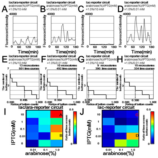 Intriguingly, similar effects of inducer conditions on oscillation damping were found in both the comprehensive simulation (Figure 3; Figure 5), and imaging process with comprehensive microscopic experiments (Figure 4, Figures S3 and S5–S8) (refer to the Methods Section 2.5 and the Supplementary Materials). First, both strains showed stabilized oscillation with high arabinose and low IPTG (Figure 3B,D–F, Figure 4B,D,F,H–J, Figures S7 and S8). With low arabinose, neither strain showed clear oscillation (Figure 3E,F, Figure 4I,J, Figures S7 and S8). On the contrary, with high arabinose and IPTG concentrations, the lac/ara-reporter strain shows clear oscillation (Figure 3A,E, Figure 4A,E,I, Figures S7 and S8), whereas the lac-reporter strain does not (Figure 3C,F, Figure 4C,G,J, Figures S7 and S8).
