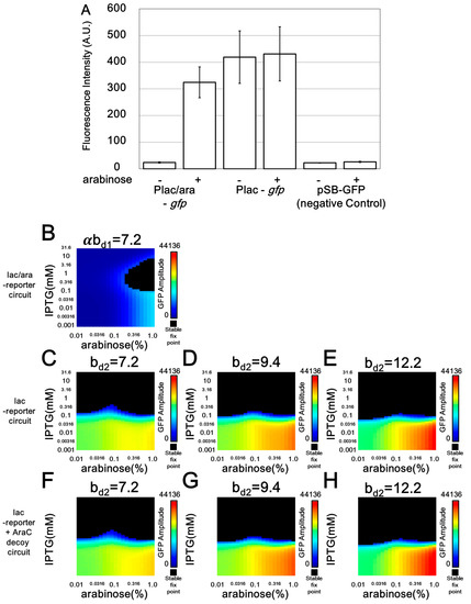 Effects by difference in maximum transcription rate of a reporter gene. (A) To quantitatively determine the performance of the lac/ara and lac promoters (pJSDT171 and pJSDT271 plasmids) in the presence or absence of arabinose, the fluorescence intensities of the reporter strains constitutively expressing AraC were measured. The assays were performed in quadruplicate. Error bars indicate the standard deviation. (B–H) The behaviors of Smolen oscillators with respect to arabinose concentration (x-axis) and IPTG concentration (y-axis) are shown by deterministic simulation. The colors in the heat map demonstrate the amplitude of GFP in the oscillation. Black regions show stable fixed points. αbd1 and bd2 represent maximum transcription rate of downstream lac/ara promoter and lac-reporter, respectively.