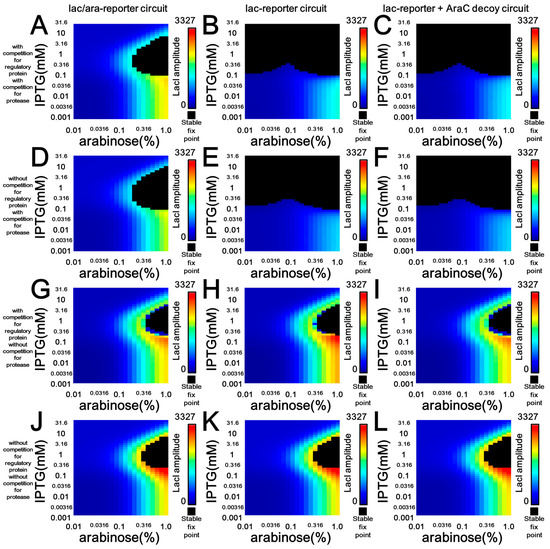Oscillation stability in the presence or absence of downstream molecular competitions by deterministic simulation. Deterministic simulation shows the behaviors of the Smolen oscillators with respect to arabinose (x-axis) and IPTG concentrations (y-axis). The colors in the heat map demonstrate the amplitude of LacI in the oscillation. Black regions show stable fixed points. (A–C) Simulation with both downstream competitions from protein-binding sites to their regulatory proteins and from target proteins to their tag-specific proteases. (D–E) Simulation without downstream competition from protein-binding sites to their regulatory proteins and with downstream competition from target proteins to their tag-specific proteases. (G–I) Simulation with downstream competition from protein-binding sites to their regulatory proteins and without downstream competition from target proteins to their tag-specific proteases. (J–L) Simulation without downstream competition from protein-binding sites to their regulatory proteins and from target proteins to their tag-specific proteases.
