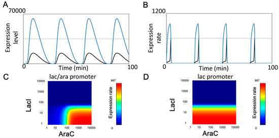 To predict the dynamic behaviors of the components in the genetic circuit models, we constructed mathematical models based on biochemical reactions (e.g., the dynamics of interactions with the promoter, protein synthesis and decay of the components). Our mathematical models were mostly based on previous papers [11,12,29,30]. We modified the previous model based on recent findings and measurements where one LacI tetramer protein formed a DNA loop, not two LacI tetramer proteins (Figure S1) [31,32,33]. We thus defined the loop dissociation rate (kul) [34], the loop forming rate (kl) and the loop unforming rate (k-l) [31]. Binding rates (ka) at the AraC protein binding site were determined in a previous study, and these indicated that IPTG weakly inhibits arabinose-binding to AraC [11,35]. Detailed mathematical modeling and simulation methods are described in the Supplementary Materials. All parameters are described in Appendix A.