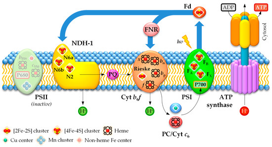 The photosynthetic electron transport chain requires the participation of metal-rich protein complexes common to all photosynthetic organisms [85]. Cytochrome b6f contains six atoms of Fe, comprising the Rieske [2Fe–2S] cluster and four hemes (heme f, heme bp, heme bn, and heme x), and one Mg2+ ion bound to a chlorophyll a molecule [228]. The soluble electron carriers PC and cytochrome c6 contain one Cu and one Fe atom, respectively [229]. PSI contains 12 Fe atoms in the form of three [4Fe–4S] clusters and 96 Mg2+ ions bound to chlorophyll a molecules and Fd contains one [2Fe–2S] cluster [230].