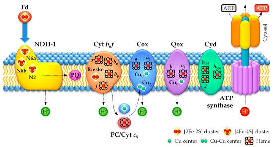 Heterocyst bioenergetics is based on a regulated and coordinated functioning of the respiratory and PSI-dependent photosynthetic electron transport chains and the supply of reduced carbon compounds in the form of sucrose and Ala from vegetative cells to provide heterocysts with reducing equivalents. These electron chains are composed of a series of metalloprotein complexes that transfer electrons from donors, such as NAD(P)H and Fd, to different acceptors via redox reactions performed by metal clusters. Thus, the electron transfer creates a proton electrochemical gradient that drives the synthesis of ATP and electrons are terminally accepted by O2 in the respiratory chain producing H2O, or Fd in the PSI-dependent photosynthetic chain.