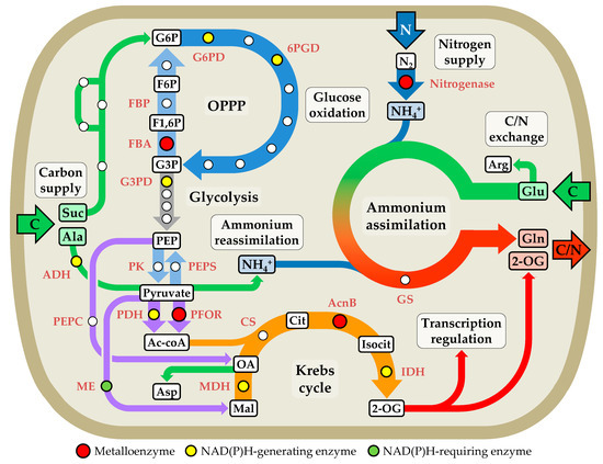 N2 fixation and H2 evolution are closely linked processes in heterocysts [152]. These specialized cells possess several nitrogenases and hydrogenases, which contain metals in their active sites that are only rarely used elsewhere in nature, such as Mo or V in nitrogenases and Ni in hydrogenases.