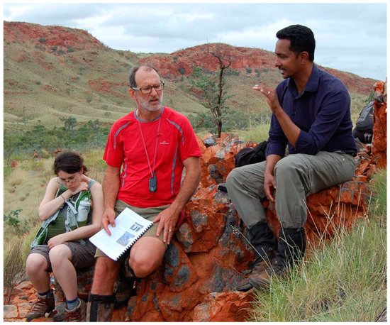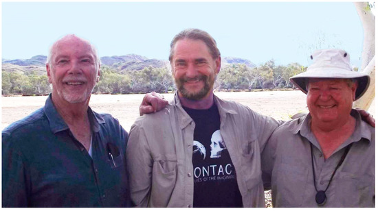 At the end of our trip we camped on the Shaw River next to the Strelley Pool Formation, the original stromatolite discovery outcrop. Malcolm invited us to give an informal talk to the captive audience, and we were happy to oblige. During the talk we explained the hot spring hypothesis that you and I had been developing and how it fit into what we had seen in Pilbara. That talk rang a bell with Martin, because his student Tara had recently discovered evidence of the mineral geyserite in the Dresser formation, which can only form in conditions associated with fresh water hot springs like those in Yellowstone. In 2017, Tara was first author on a paper in Nature Communications [10], and Martin was first author of an article in Scientific American in which we had a chance to explain the hot spring hypothesis for public consumption [3]. Here is a photo of me (left), you (center), and Malcolm (right), standing on the banks of the Shaw River that day (Figure 9).