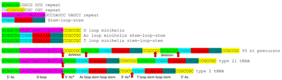 In summary, type I and type II tRNAs evolved as follows (Figure 1). Here, 3–31 nucleotide minihelices were ligated to form a 93-nucleotide tRNA precursor. An internal deletion of nine nucleotides within the sequence CCGCCGCGCGGCGG left GGCGG, the last five nucleotides of the D loop region before the 5′-anticodon stem. In type I tRNAs, an internal deletion of nine nucleotides within the sequence CCGCCGCGCGGCGG left the sequence CCGCC, which became the V loop. In type II tRNAs, the sequence CCGCCGCGCGGCGG was maintained with no processing, forming the first iteration of the expanded V loop. Type II tRNAs, therefore, formed from a predicted intermediate in the formation of type I tRNAs, and, furthermore, the same model describes evolution of type I and type II tRNAs. Generation of tRNAomes, which are the complete sets of tRNAs for an organism, resulted in many sequence changes in tRNAs, in order to specify attachments of different amino acids. Every aspect of this detailed evolution model is supported by statistical tests [3,4]. Conserved deviations in typical tRNAs from tRNAPri in Figure 4 can largely be explained by selective pressures of tRNA folding [3,4,5].