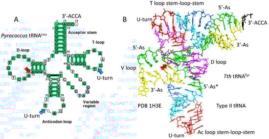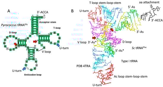 - Quigley, G.J.; Rich, A. Structural domains of transfer RNA molecules. Science 1976, 194, 796–806. [Google Scholar] [CrossRef]