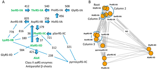 Homologous aaRS enzymes tend to arrange in genetic code columns indicating co-evolution of aaRS enzymes and the genetic code [2,4,5,27,28]. In Figure 6B, circles are drawn around related aaRS enzymes that group within genetic code columns. In archaea, AspRS-IIB and AsnRS-IIB are closely related, and HisRS-IIA is related. In bacteria, AspRS-IIB, AsnRS-IIB and LysRS-IIB are closely related, and HisRS-IIA is related. Archaea utilize LysRS-IE. In bacteria, LysRS-IIB may have evolved from AspRS-IIB.