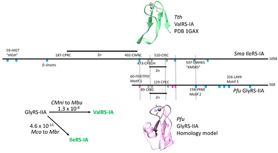 A schematic sequence alignment of a class IIA aaRS and a class IA aaRS is shown [2,5]. The shared Zn fingers are shown as structures. Cyan blocks indicate active site β-sheets. Grey blocks indicate shared β-sheets that organize Zn fingers. Magenta blocks indicate β-sheets surrounding the Zn finger in Pyrococcus furiosis (Pfu) GlyRS-IIA that are organized by the Zn finger. Tth indicates Thermus thermophilus. NCBI tools were used to find close matches comparing GlyRS-IIA and IleRS-IA and GlyRS-IIA and ValRS-IA, in order to demonstrate homology of class I and class II aaRS enzymes. e-values are shown. The species compared are indicated: Candidatus Methanoperedens nitroreducens (CMni), Methanococcoides burtonii (Mbu), Methanobacterium congolense (Mco), and Methanobacterium bryantii (Mbr). Green type indicates ValRS-IA and IleRS-IA have editing active sites.