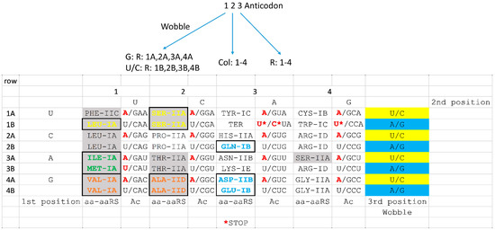 Location of Gly to column 4, row 4 (second and third position C), is consistent with Gly being the primordial encoded amino acid, as indicated in Figure 1, Figure 2, and Figure 4, and, as has also been posited by others [1,2,4,5,48,49,50]. Location of Val, Ala, Asp, and Gly, which are likely the first four encoded amino acids [27], to row 4 (favored third anticodon position C), is also consistent with a tRNA-centric view of coevolution. Phe, Tyr, Cys, and Trp are four of the last amino acids encoded, and these amino acids are relegated to the least favored row 1 (third anticodon position A) (Figure 11). Stop codons, which are recognized by proteins, not tRNAs, and are, therefore, not bounded by anticodon preferences, are also relegated to disfavored row 1, as expected. The genetic code, therefore, evolved around the tRNA anticodon by a predictable pathway. aaRS enzymes coevolved with tRNAomes and the genetic code (Figure 9 and Figure 10). The patterns of code evolution are apparent in the patterns of aaRS coevolution and the coevolution of related amino acids. Interpreting tRNAome evolution is somewhat more challenging, but, in ancient archaea, before extensive radiation and often convergence of tRNA sequences, a few examples of tRNA relatedness within columns and a few examples of tRNA relatedness within a row and across neighboring columns are evident.