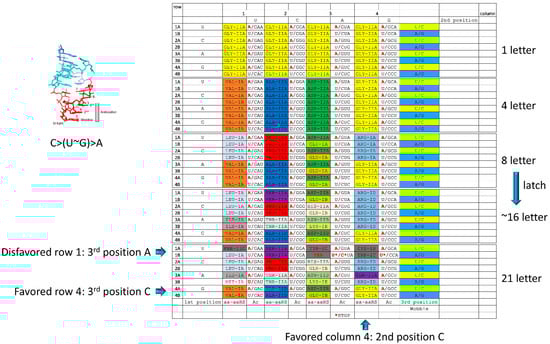 In order to achieve single base recognition at the third anticodon position, and in order to read the wobble position, enhanced accuracy was required in ribosome recognition of the tRNA anticodon. The tRNA-aa enters the ribosome in complex with G-protein GTPase EF-Tu. The ribosome and EF-Tu·GTP→GDP·tRNA-aa·mRNA forms a “latch”, tightening the codon-anticodon interaction and enhancing translational accuracy. In the Thermus thermophilus ribosome, the latch is formed of invariant residues 16S rRNA G530, A1492 and A1493 and 23S rRNA A1913 [44,46,47]. The closed latch enforces Watson–Crick geometry on the second and third anticodon positions, allowing single base accuracy in reading positions 2 and 3. By contrast, at the wobble position, single base accuracy is achieved only with difficulty and essentially never at the base of code evolution. Evolution of the latch on the ribosome may have allowed further evolution of the code and a transition from an ~8-letter code to an ~16-letter code (Figure 11).